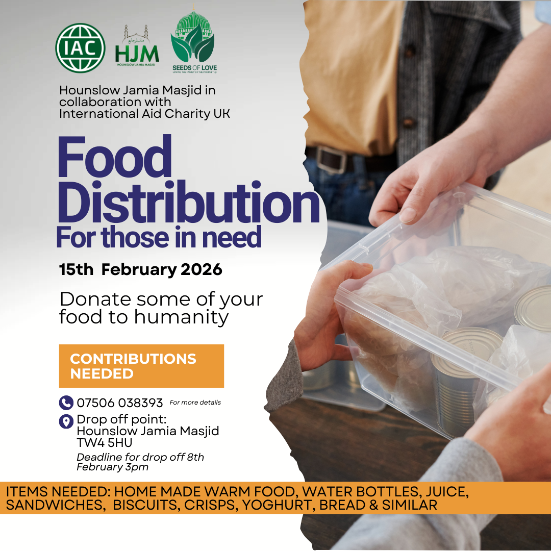 Hounslow Jamia Masjid in collaboration with International Aid Charity UK Food Distribution for those in need Donate some of your food for humanity Drop off point - Hounslow Jamia Masjid | TW4 5HU Contributions needed: ITEMS NEEDED: HOME MADE WARM FOOD, WATER BOTTLES, JUICE, SANDWICHES, BISCUITS, CRISPS, YOGHURT, BREAD & SIMILAR Deadline for drop off […]