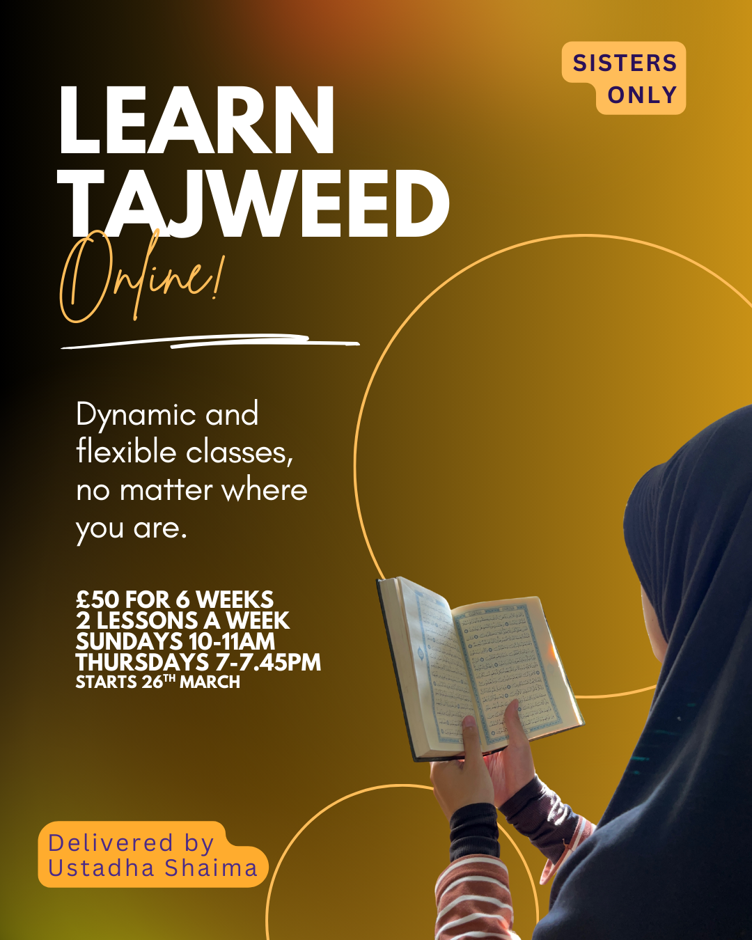 Online , United KingdomSisters Adult Tajweed for sisters aged 16 to adult 6 week class delivered online with Ustadha Shaima (Algeria) Register below £50 for the entire 6 weeks. 2 lessons a week Sundays 10-11am and Thursdays 7-7.45pm Max 20 students Starts Thursday 26th March 2026 Register here https://pci.jotform.com/form/260282664655362