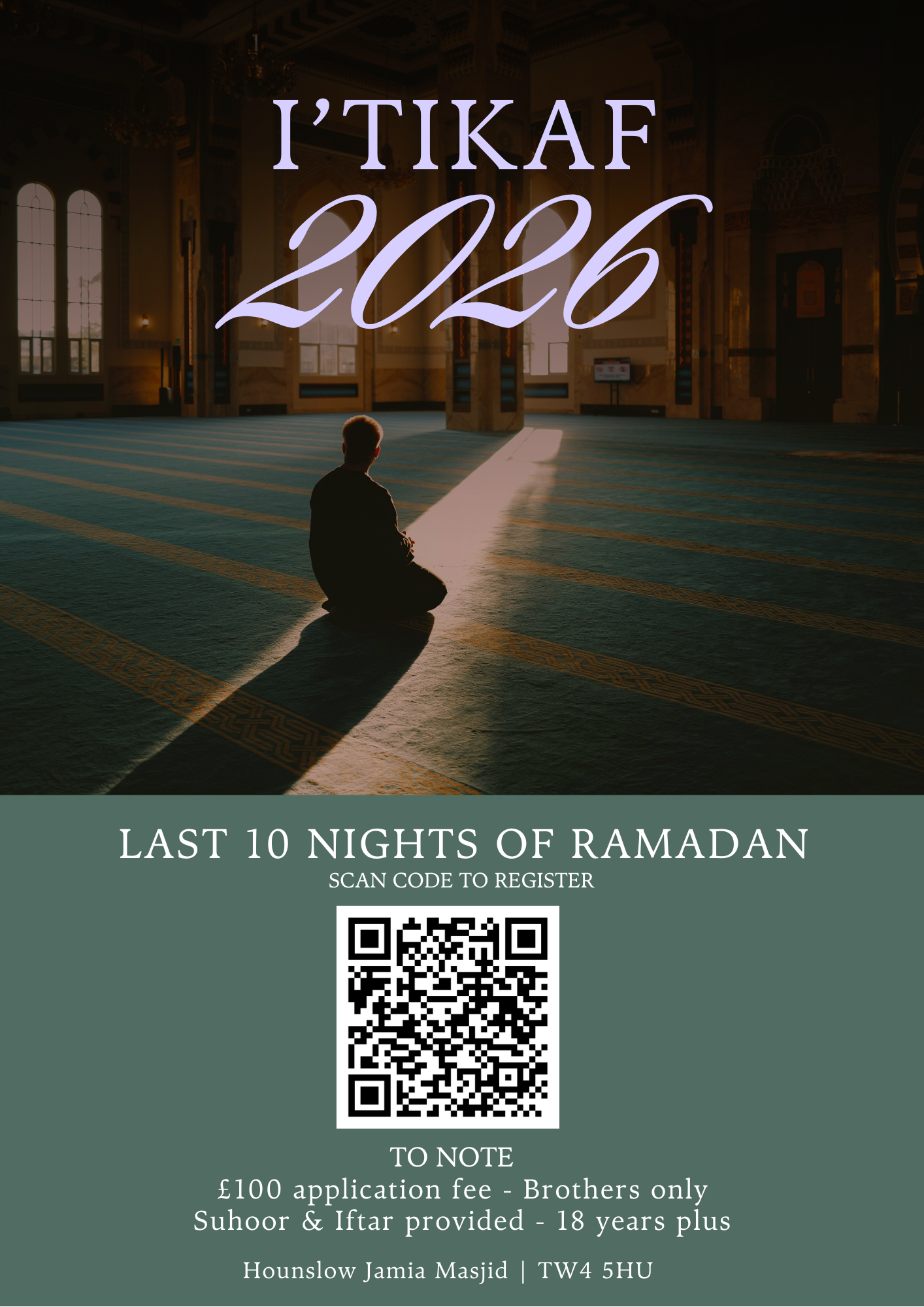 Hounslow Jamia Masjid 367 Wellington Road South Hounslow, TW4 5HU United Kingdom, United KingdomRAMADAN ITIKAF 2026 Applications now open Last 10 nights of Ramadan Brothers Only Suhoor & Iftar provided 18 + Only Complete online form and payment here https://pci.jotform.com/form/260262268741356