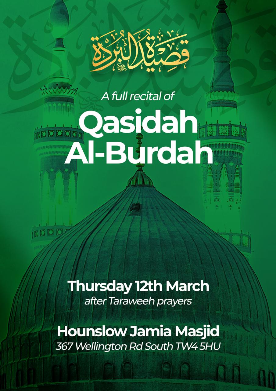 Hounslow Jamia Masjid 367 Wellington Road South Hounslow, TW4 5HU United Kingdom, United Kingdom•••SPECIAL QASIDAH AL BURDAH GATHERING••• THURSDAY 12TH MARCH AFTER TARAWEEH PRAYERS Join us on Thursday 12th March for the full recital of the famous Qasida Burdah DATE & TIME: Thursday 12th March 2026 from 9.30pm Refreshments served at the close ***** Free Event | Open to brothers and sisters ***** Venue: Hounslow Jamia Masjid 367 […]