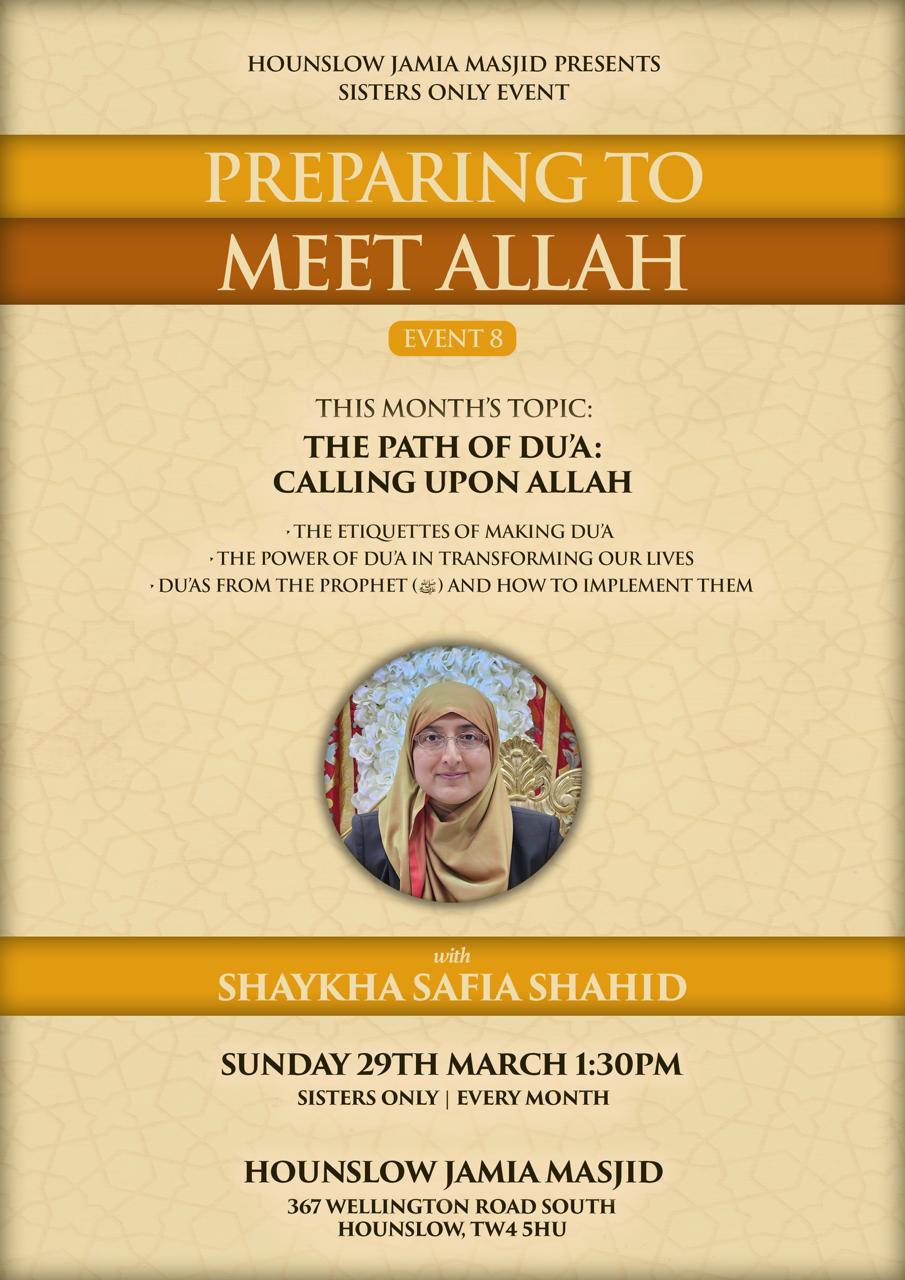 Hounslow Jamia Masjid 367 Wellington Road South Hounslow, TW4 5HU United Kingdom, United KingdomPreparing to Meet Allah Event 8 March 29th @ 1:30 pm A Monthly series of events with Shaykh Safia Shahid This month’s topic: The Path of Du’a: Calling Upon Allah •The etiquettes of making du’a •The power of du’a in transforming our lives •Du’as from the Prophet (ﷺ) and how to implement them SISTERS ONLY […]