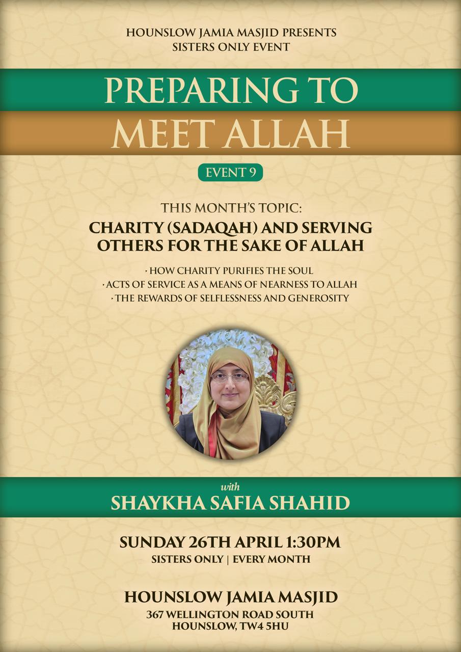 Hounslow Jamia Masjid 367 Wellington Road South Hounslow, TW4 5HU United Kingdom, United KingdomPreparing to Meet Allah Event 9 Sunday April 26th @ 1:30 pm A monthly series of events with Shaykha Safia Shahid This month’s topic: Charity (Sadaqah) and Serving Others for the Sake of Allah How charity purifies the soul Acts of service as a means of nearness to Allah The rewards of selflessness and generosity […]