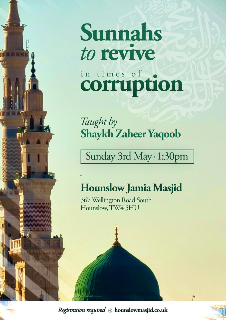 Hounslow Jamia Masjid 367 Wellington Road South Hounslow, TW4 5HU United Kingdom, United KingdomSunnahs to revive in times of Corruption The Prophet ﷺ said: “Ahead of you there lie days of patience, during which being patience will be like grasping a hot coal. The one who does good deeds then will have a reward like that of fifty men who do such deeds. Those present said: O Messenger of […]