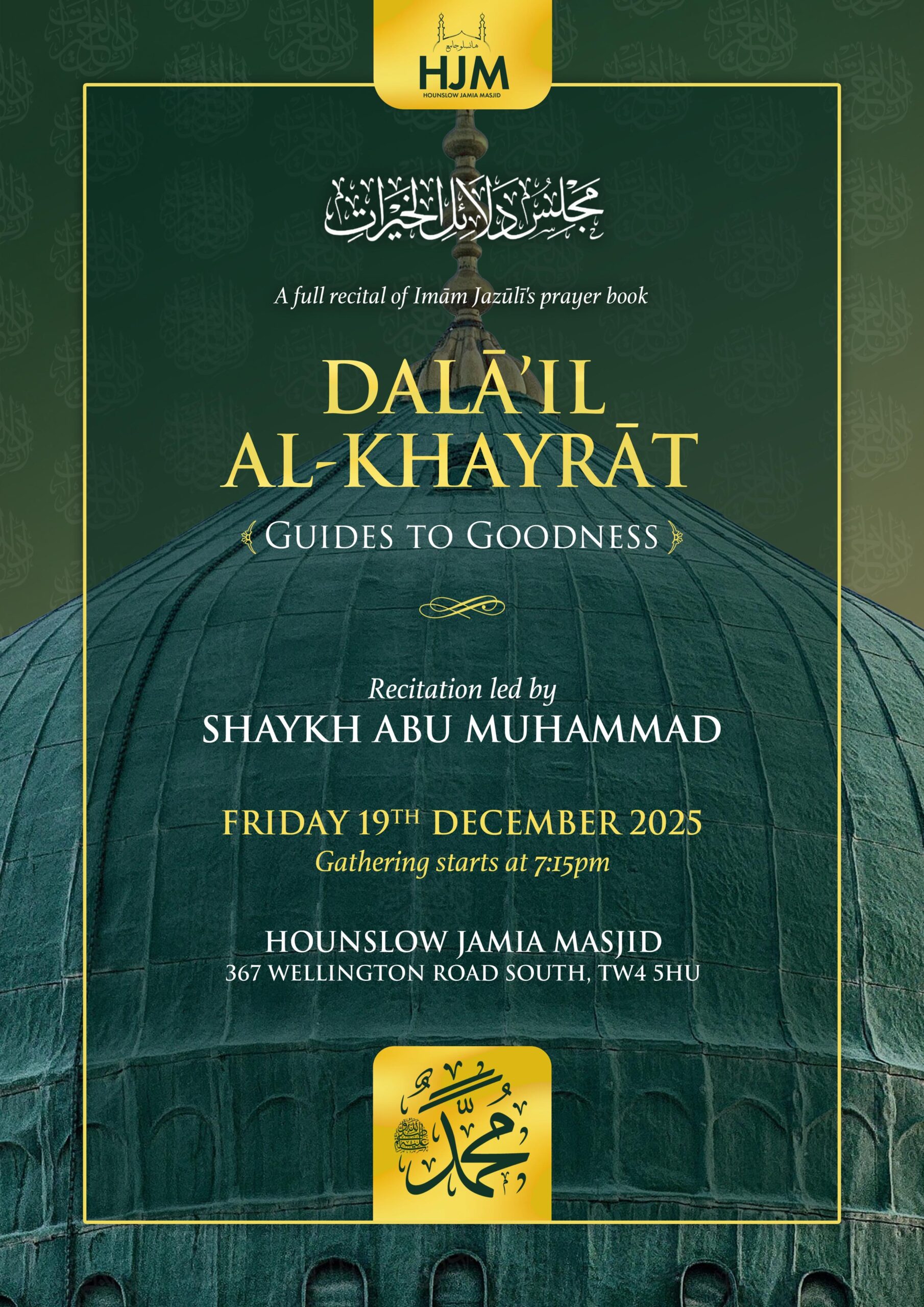Hounslow Jamia Masjid 367 Wellington Road South Hounslow, TW4 5HU United Kingdom, United KingdomFull recital of the Dalail Al Khayrat With special guest Shaykh Abu Muhammad Friday 19th December at Hounslow Jamia Masjid & Islamic Centre – from 7pm Open to all Refreshments […]