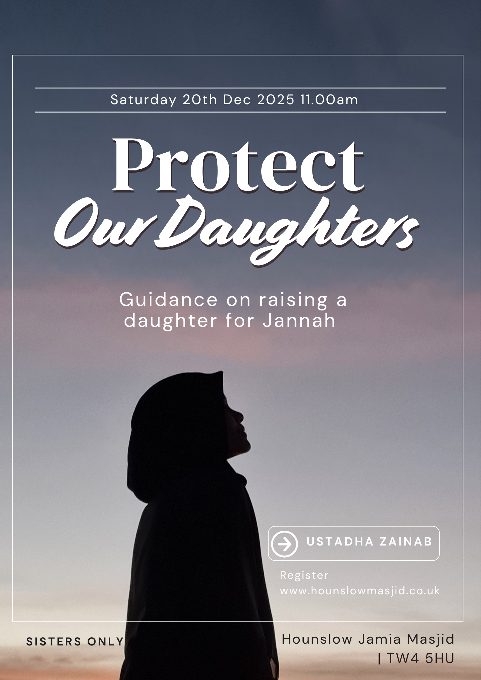 Hounslow Jamia Masjid 367 Wellington Road South Hounslow, TW4 5HU United Kingdom, United KingdomProtect Our Daughters - NEW DATE Saturday 20th December 11am Guidance on raising a daughter for Jannah SISTERS ONLY Is beauty the benchmark today? Hijabi influencers, tiktok dances, makeup, feminism, […]