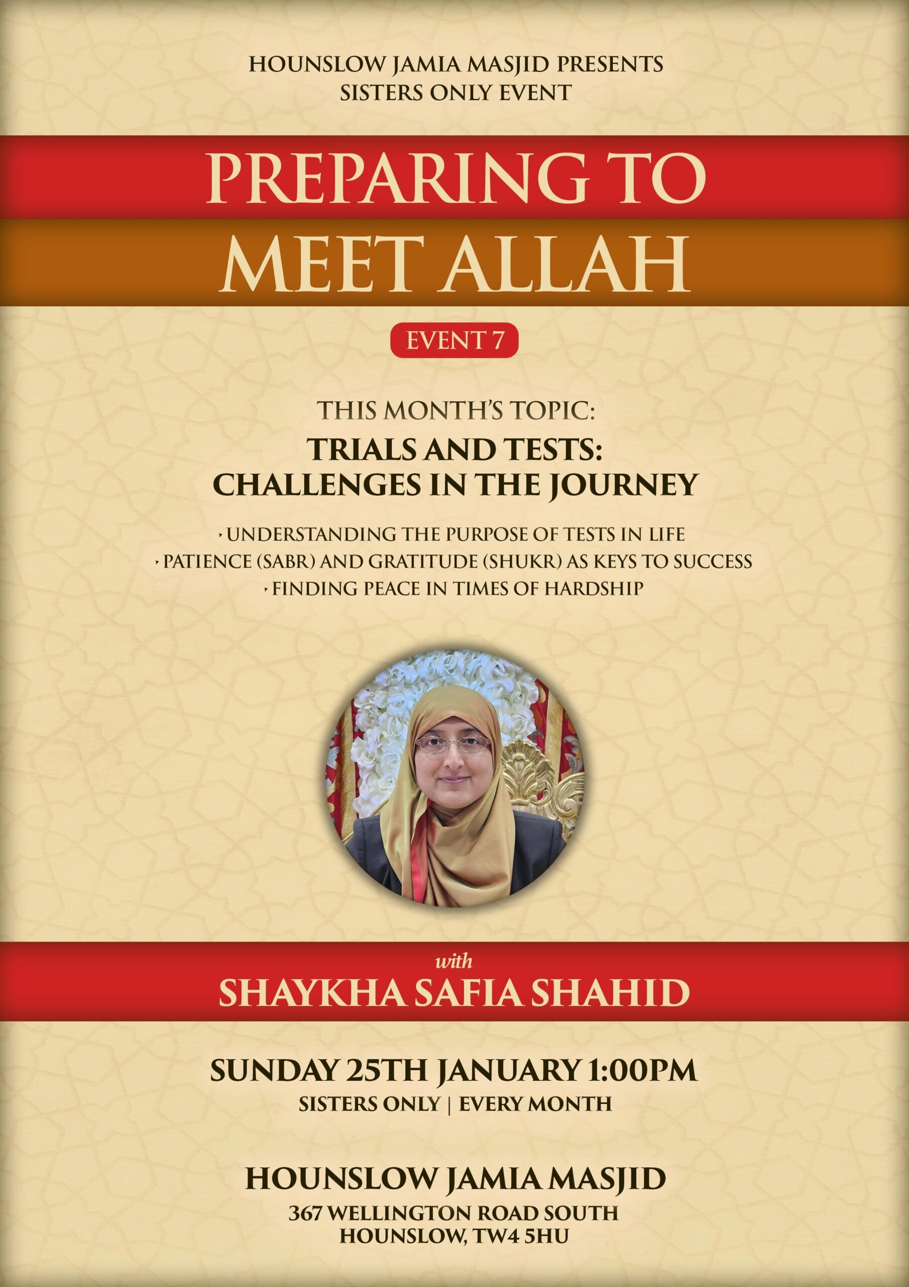 Hounslow Jamia Masjid 367 Wellington Road South Hounslow, TW4 5HU United Kingdom, United KingdomPreparing to Meet Allah Event 7 January 25th @ 1:00 pm-2:30 pm A Monthly series of events with Shaykh Safia Shahid This month’s topic: Trials and Tests: Challenges in the […]