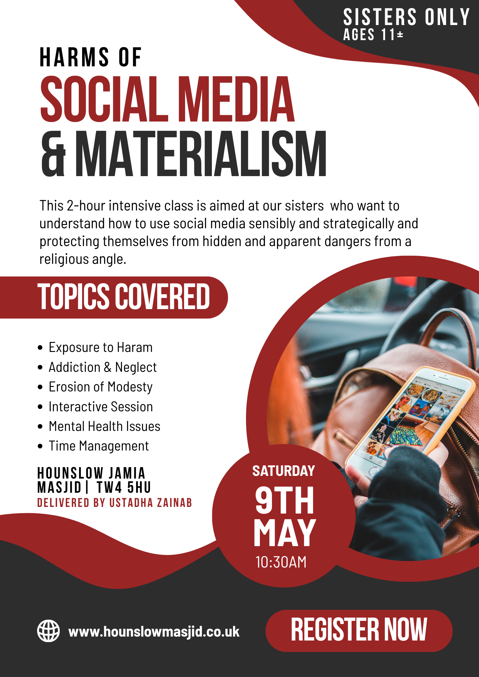Hounslow Jamia Masjid 367 Wellington Road South Hounslow, TW4 5HU United Kingdom, United KingdomThis 2-hour intensive class is aimed at our sisters who want to understand how to use social media sensibly and strategically and protecting themselves from hidden and apparent dangers from […]
